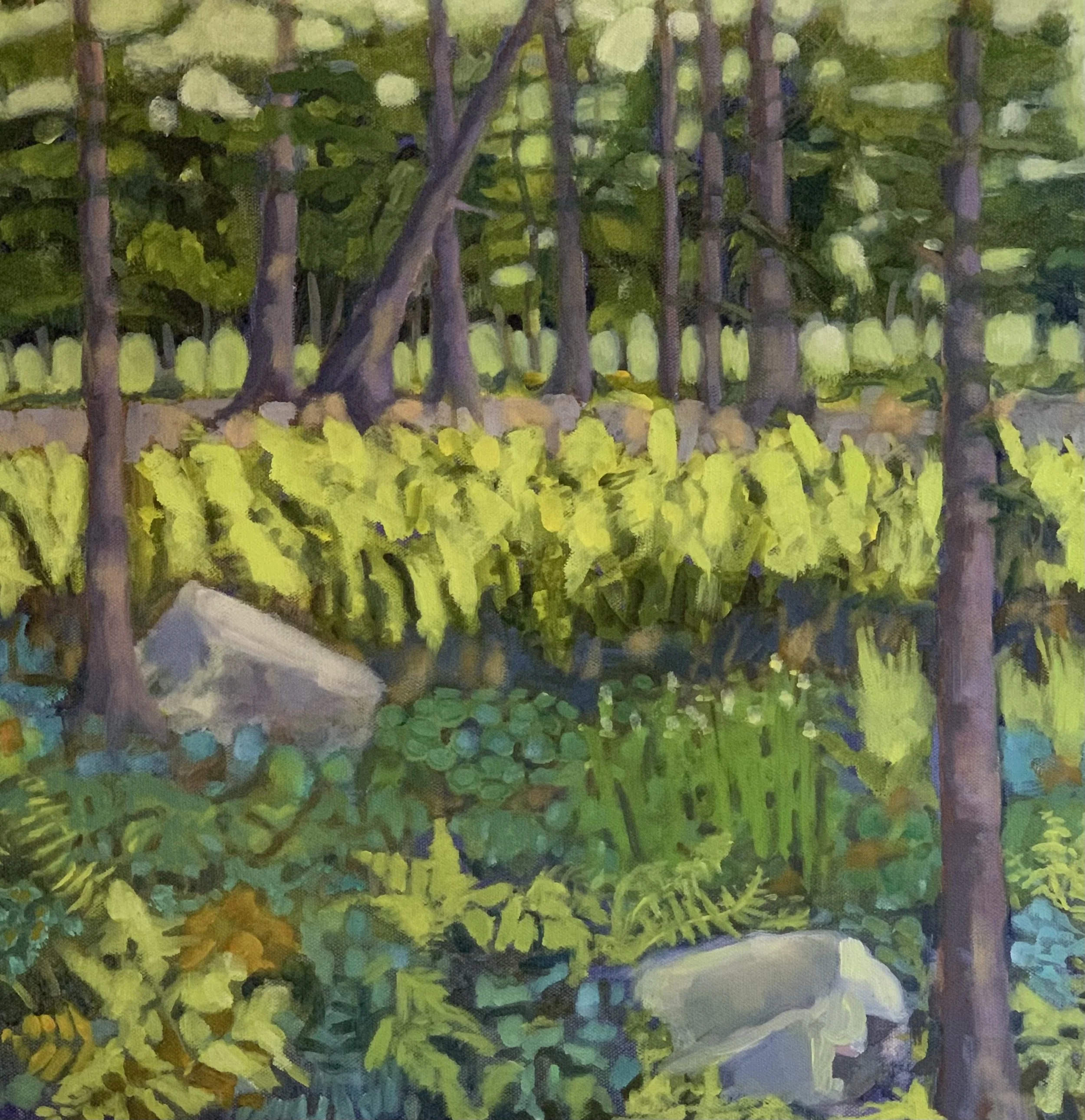 Lately, I’ve been painting strange sightings in the sky—bloody sunsets in Maine and three suns in Massachusetts. It feels like nature is reaching out to warn us. In Maine, there are 250 acres up the road that has been strip logged where hundreds of trees are falling as a result of the disrupted root system followed by the wind shear from micro wind bursts. There are menancing uprooted trees balls, jagged-edged trunks and precariously tilted deadfall. It’s like walking past a car accident, you can’t help but rubber neck but do you really want to see the bodies? I keep a close eye when I walk the road near them.